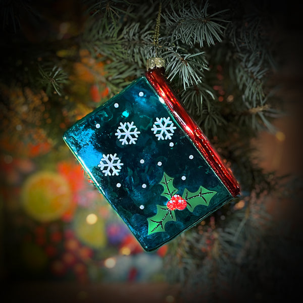 Made from blown glass and shaped like a little book, it’s finished in shimmering turquoise blue with white, yellow, red, and golden details, festive holly, and snowy accents that capture the cozy spirit of the season.