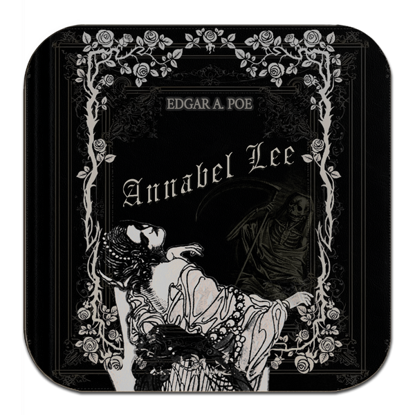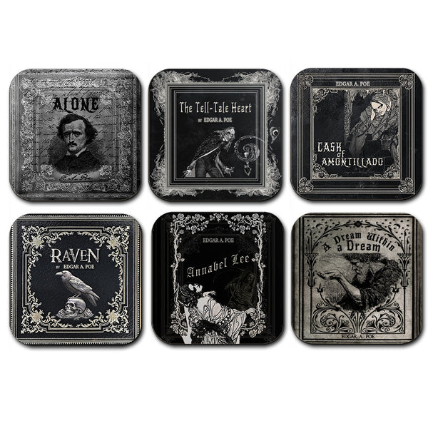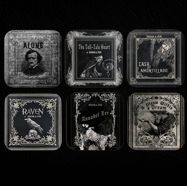 Edgar Allan Poe Coaster Set featuring: The Raven, Tell-Tale Heart, Annabel Lee, Cask of Amontillado, Alone, Dream Within a Dream.