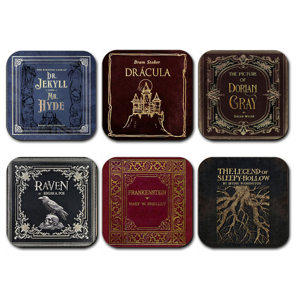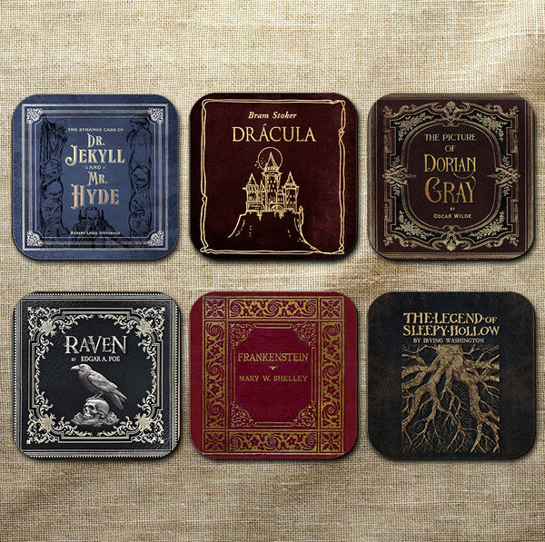Gothic Literature Coaster Set. Dracula, Frankenstein, Sleepy Hollow, The Raven, Jekyll and Hyde, Dorian Gray. Bookish Home Decor Halloween gift.